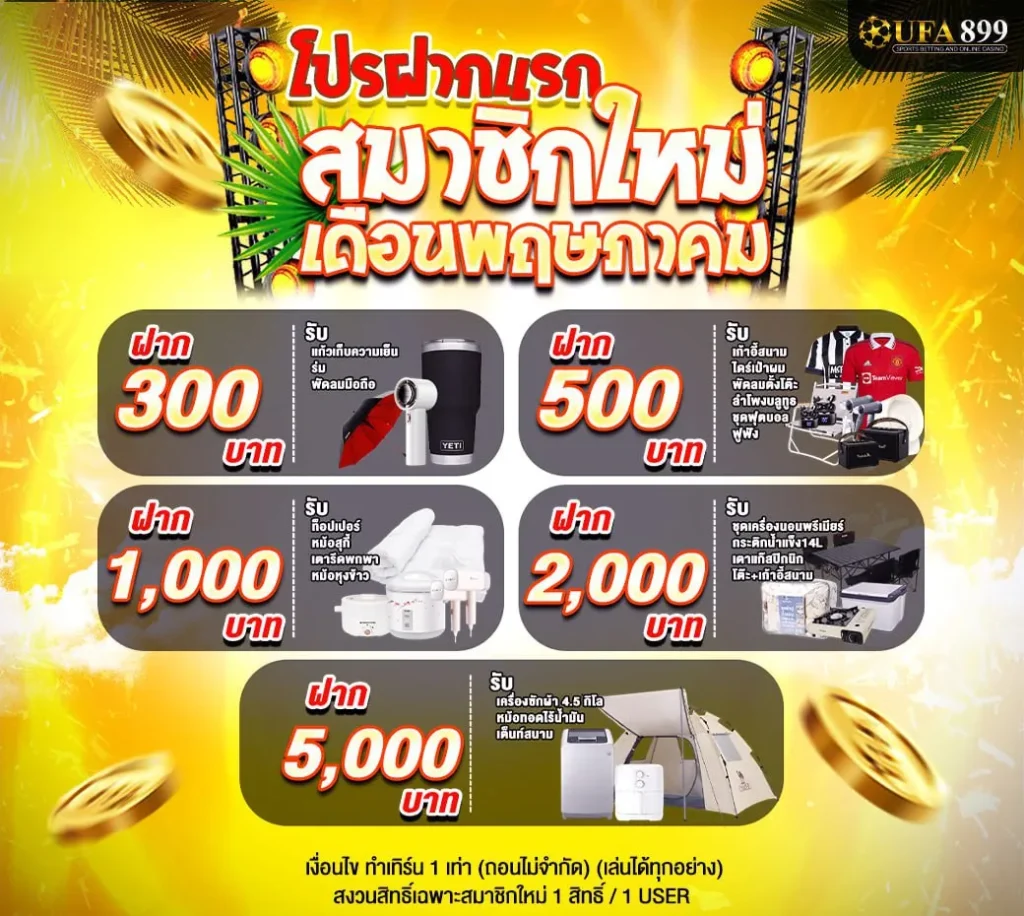 • ฝาก 5,000 บาท รับ เครื่องซัก 4.5 กิโล,หม้อทอดน้ำมัน,เต้นสนาม