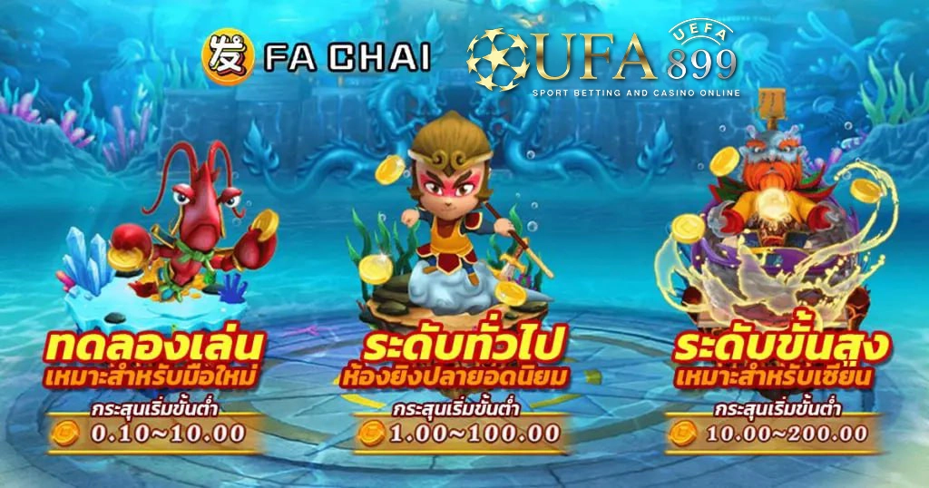 เกมยิงปลาของ FA CHAI มีให้ทดลองเล่นด้วยกระสุนขั้นต่ำ 0.10 บาท ซึ่งแต่ละเกมจะมีแบ่งระดับความยากง่ายในการเล่นออกเป็น 3 ระดับด้วยกัน ผู้เล่นได้รับประสบการณ์ที่ดีด้วยการยิงปลาตายง่าย โหมดปืนล็อคเป้าฆ่าบอสเกมจ่ายเงินเยอะ
